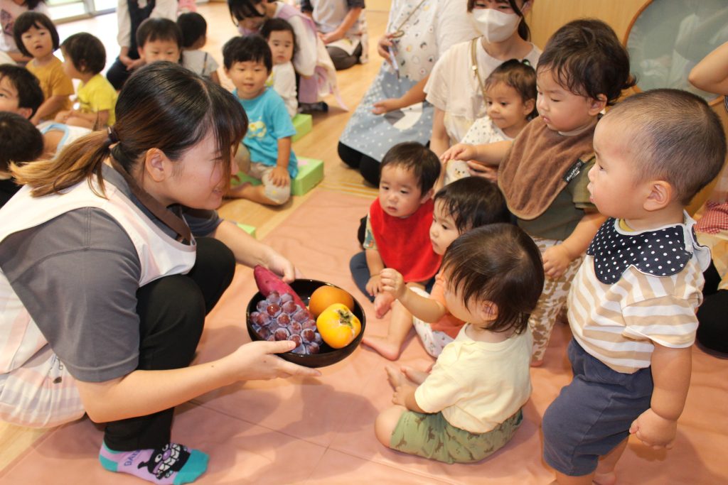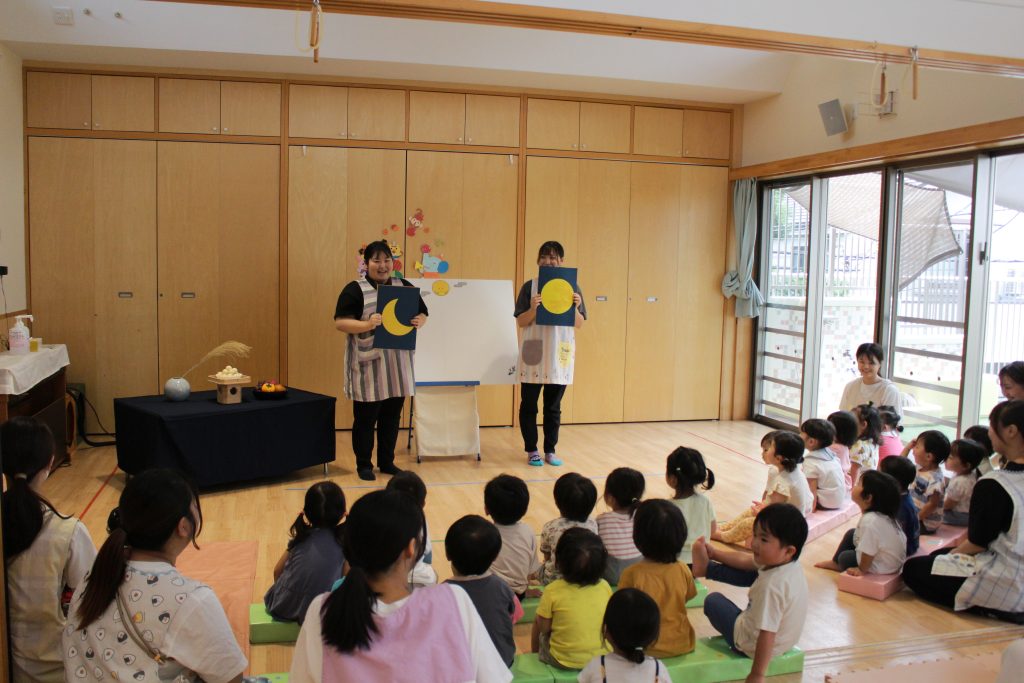最初は、「だんご だんご くっついた」の手遊びをしました。朝の会でやっていたので、この日も上手に保育者の真似をしてほっぺにだんごをくっつけたり、手を叩いたりして手遊びを楽しむ姿が見られましたよ。