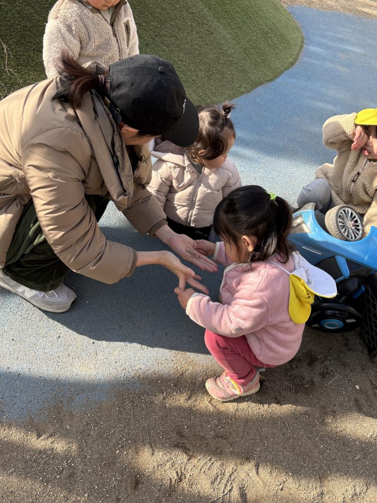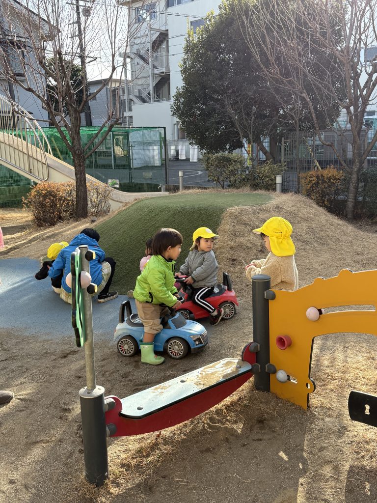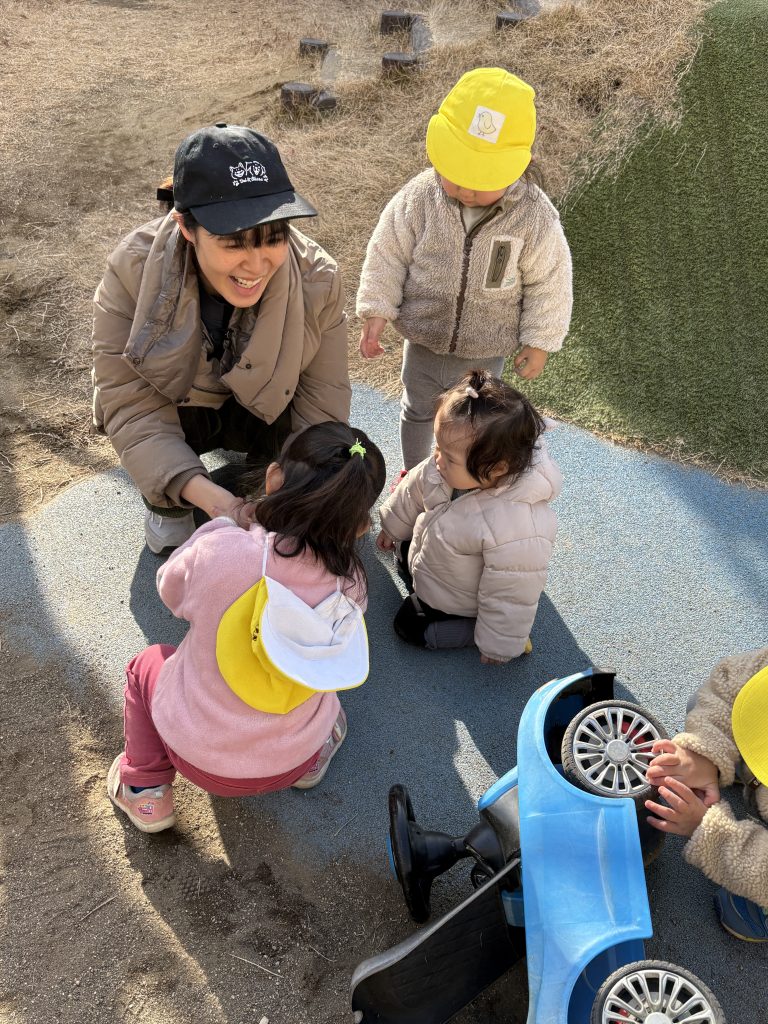 1歳児クラスのりす組さんと一緒に園庭で遊んでいましたが、